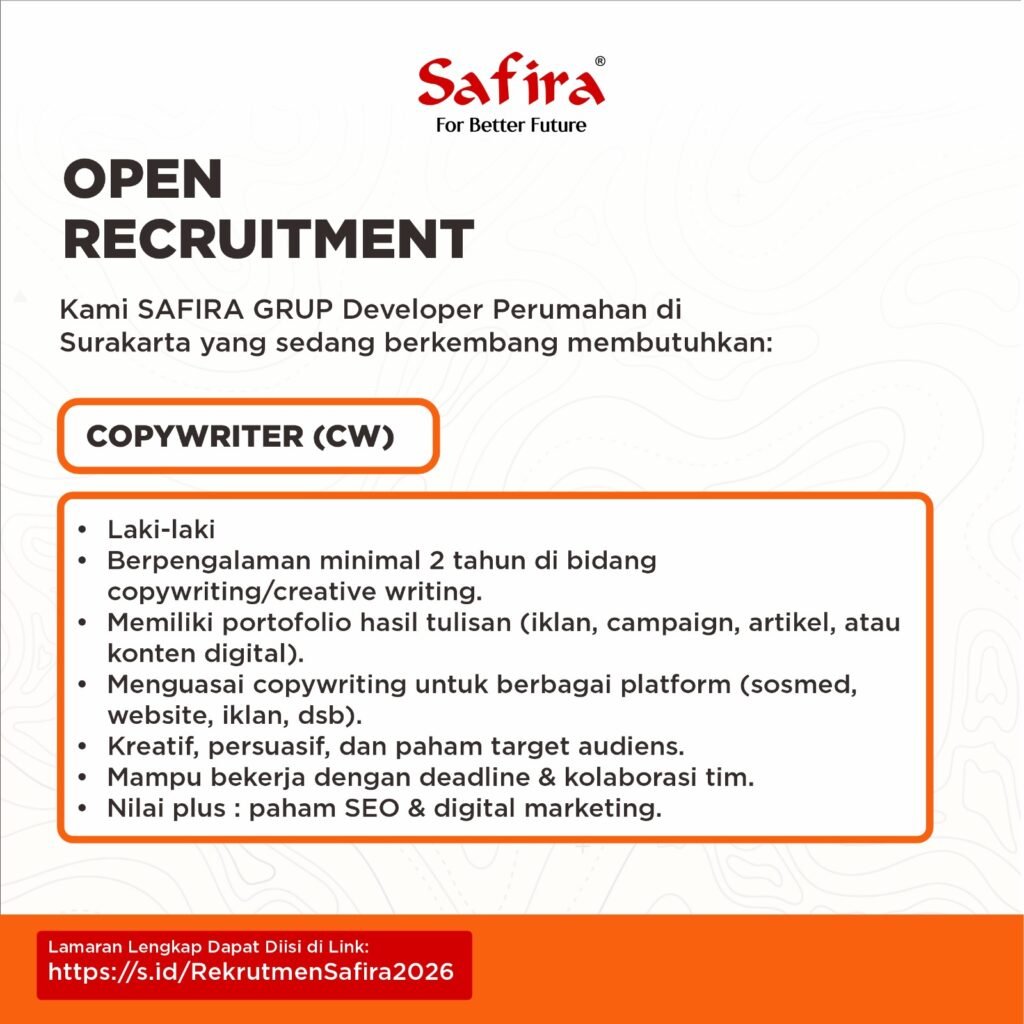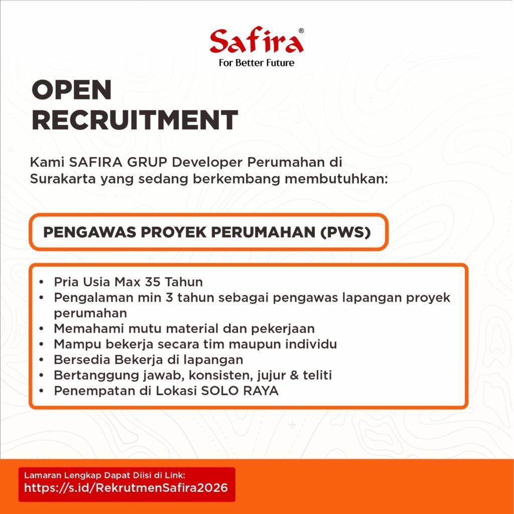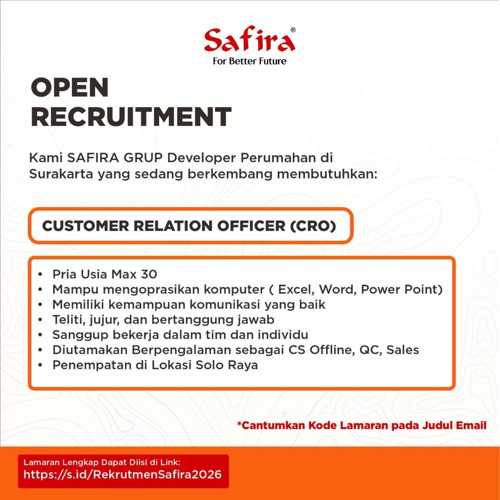 Safira Grup mencari talenta berbakat dan berpotensi untuk menjadi bagian dari salah satu pengembang perumahan ternama di Solo Raya. Kami memberikan peluang bagi anda untuk meniti karir, memperkaya potensi dengan berbagai pilihan bidang pekerjaan di Safira Grup.
