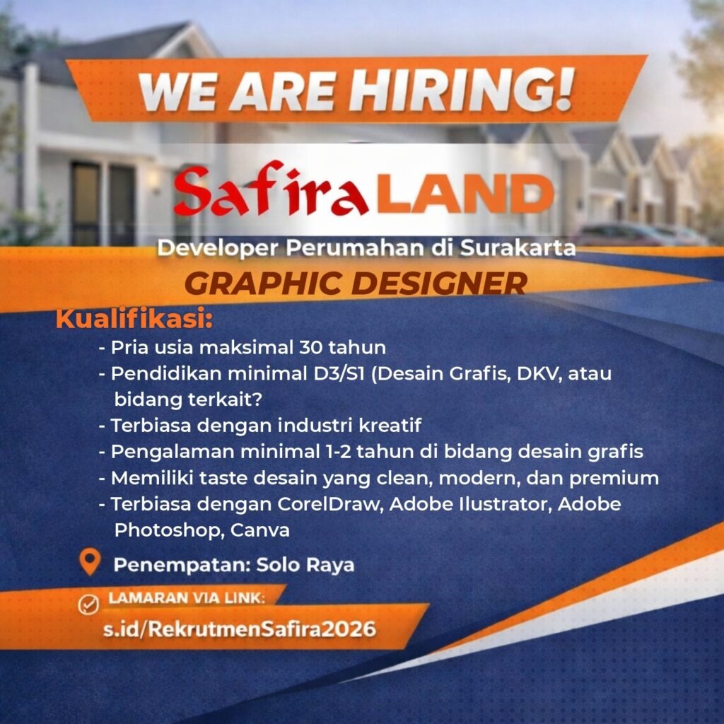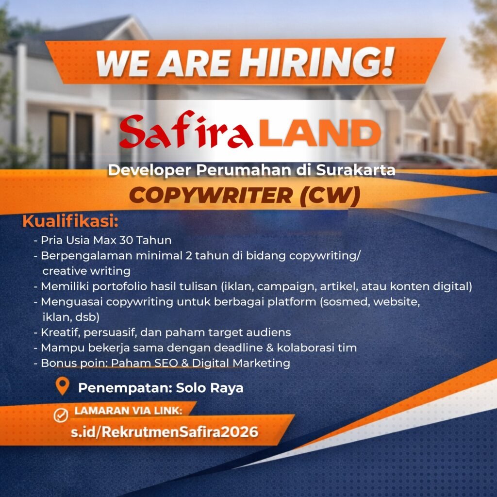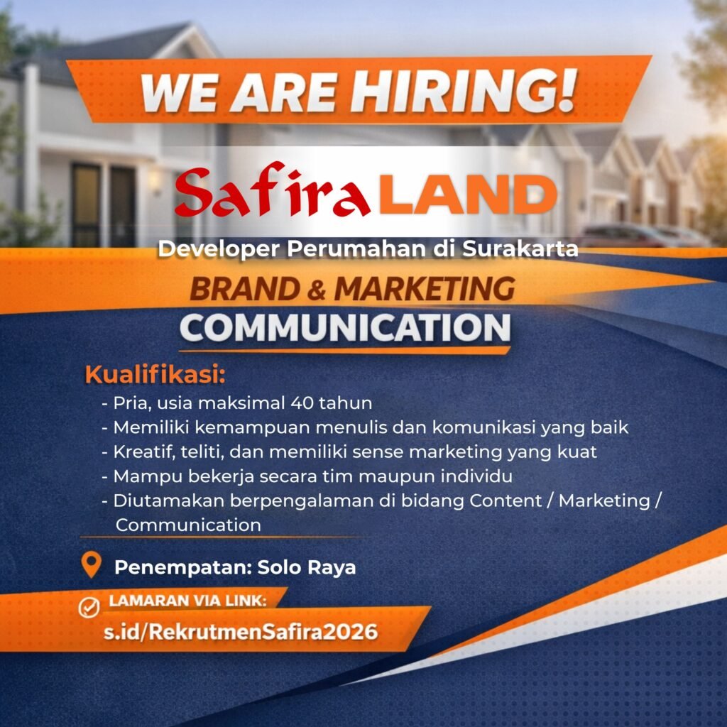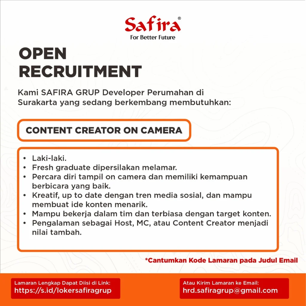 Safira Grup mencari talenta berbakat dan berpotensi untuk menjadi bagian dari salah satu pengembang perumahan ternama di Solo Raya. Kami memberikan peluang bagi anda untuk meniti karir, memperkaya potensi dengan berbagai pilihan bidang pekerjaan di Safira Grup.